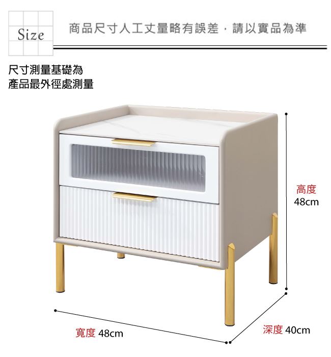 材質 | ◆產品名稱:【綠家居】厄利1.6尺岩板二抽床頭櫃 尺寸:(寬)48x(深)40(高)48/公分 ◆材質: 材質:防潮MDF板材+防鏽金漆腳座+五金滑軌結構+6mm高硬度岩板桌面 噴漆:防潮亮面噴漆處理