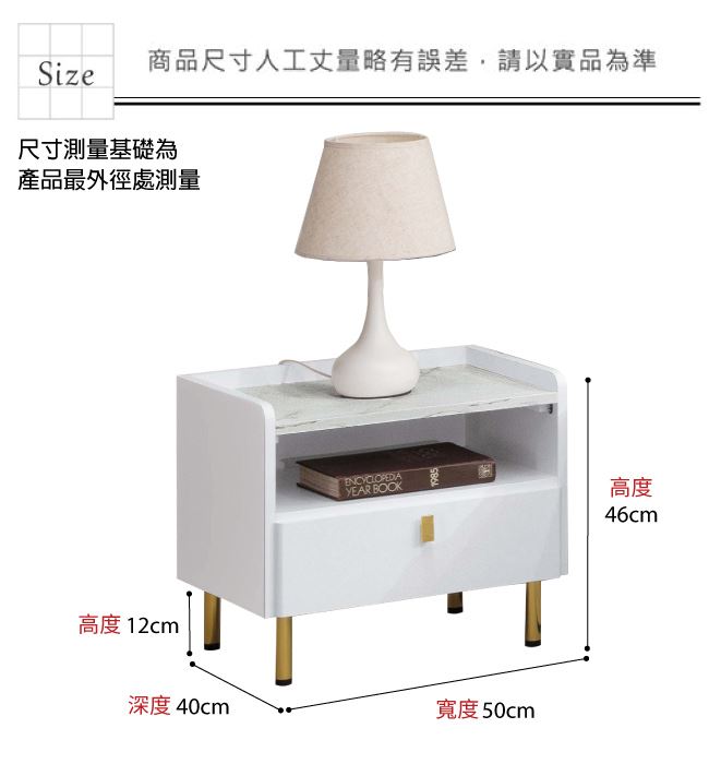 材質 | ◆產品名稱:【綠家居】溫荷克輕奢白1.7尺單抽床頭櫃 尺寸:(寬)50x(深)40(高)46/公分 ◆材質: 材質:防潮MDF板材+防鏽金漆腳座+五金滑軌結構 噴漆:防潮亮面噴漆處理