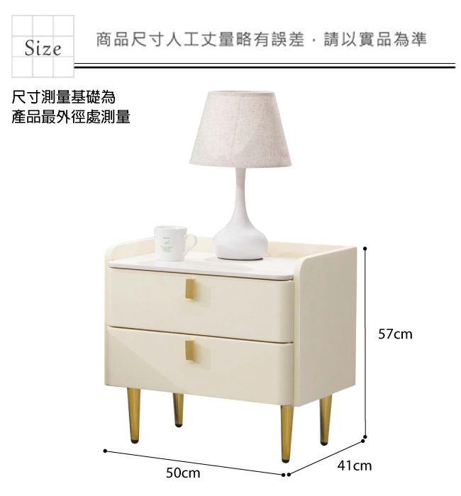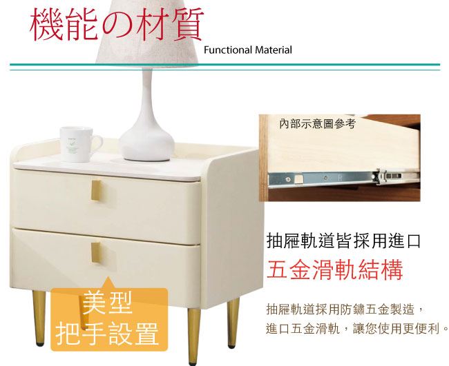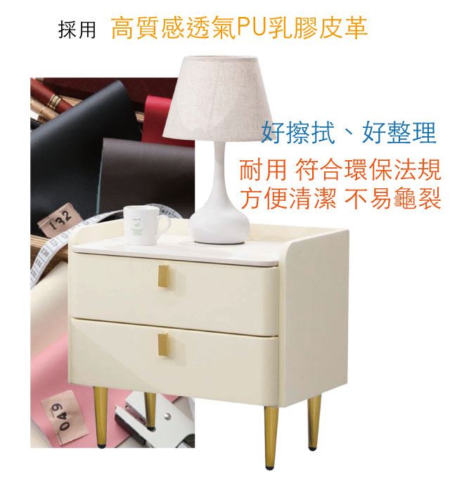 材質 | ◆產品名稱:【綠家居】蒙羅1.7尺皮革岩板二抽床頭櫃 尺寸:(寬)50x(深)41(高)57/公分 ◆材質: 材質:防潮MDF板材+防鏽金漆腳座+五金滑軌結構+6mm高硬度岩板桌面+透氣PU皮革 噴漆:防潮亮面噴漆處理