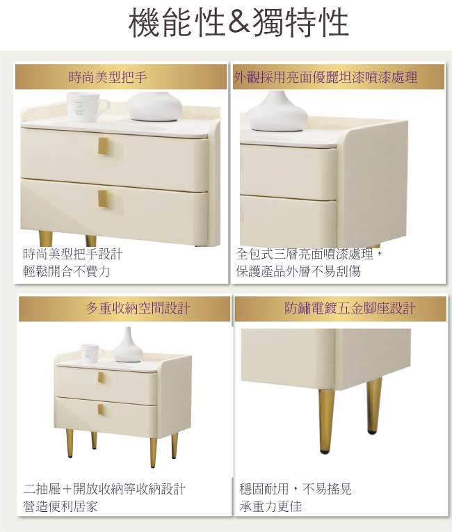 商 品 介 紹 | 【綠家居】蒙羅1.7尺皮革岩板二抽床頭櫃 奢華雙色系+現代簡約風格+安心材質製造,整體採用防潮MDF板材+防鏽金漆腳座+五金滑軌結構+12mm高硬度岩板桌面+透氣PU皮革等安心材質製造,產品外層採用防潮亮面噴漆處理搭配採用二抽屜+開放式收納等收納空間設計,全由專人配送到家,專業安心服務,替你省下更多時間! 【商品特色】 奢華雙色系+現代簡約風格+安心材質製造,使用放心+搭配居家更便利 採用防鏽金漆腳座+五金滑軌結構+12mm高硬度岩板桌面+透氣PU皮革等安心材質製造 產品外層採用防潮亮面噴漆處理 搭配採用二抽屜+開放式收納等收納空間設計 此商品不需要DIY組立,此商品為組立後之成品 品質保證、專業設計、貼心服務 全由專人配送到家,專業安心服務,替您省下更多時間