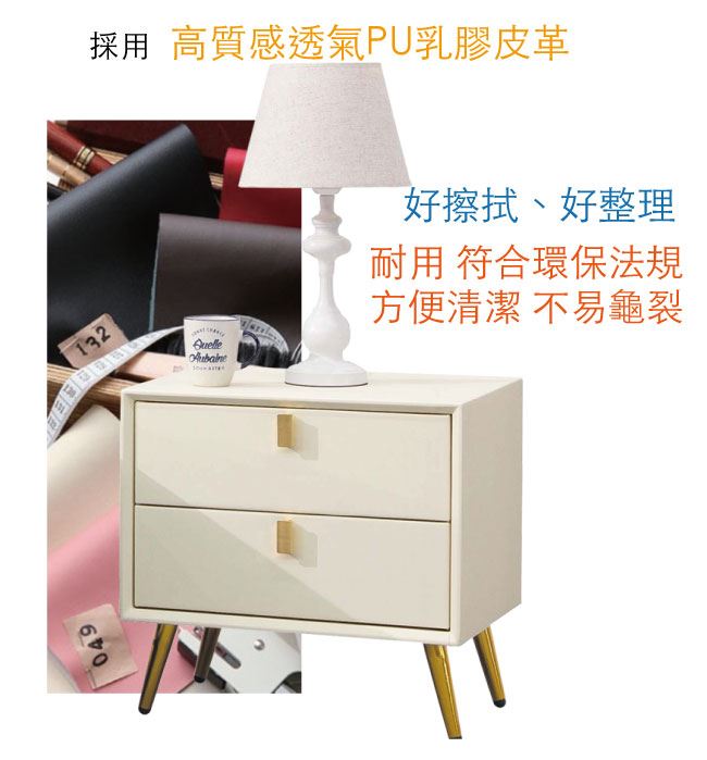 商 品 介 紹 | 【綠家居】努瓦克1.7尺皮革二抽床頭櫃 現代米色系+現代簡約風格+安心材質製造,整體採用防潮MDF板材+防鏽金漆腳座+五金滑軌結構+透氣PU皮革等安心材質製造,產品外層採用防潮亮面噴漆處理搭配採用二抽屜+開放式收納等收納空間設計,全由專人配送到家,專業安心服務,替你省下更多時間! 【商品特色】 現代米色系+現代簡約風格+安心材質製造,使用放心+搭配居家更便利 採用防潮MDF板材+防鏽金漆腳座+五金滑軌結構+透氣PU皮革等安心材質製造 產品外層採用防潮亮面噴漆處理 搭配採用二抽屜+開放式收納等收納空間設計 此商品不需要DIY組立,此商品為組立後之成品 品質保證、專業設計、貼心服務 全由專人配送到家,專業安心服務,替您省下更多時間