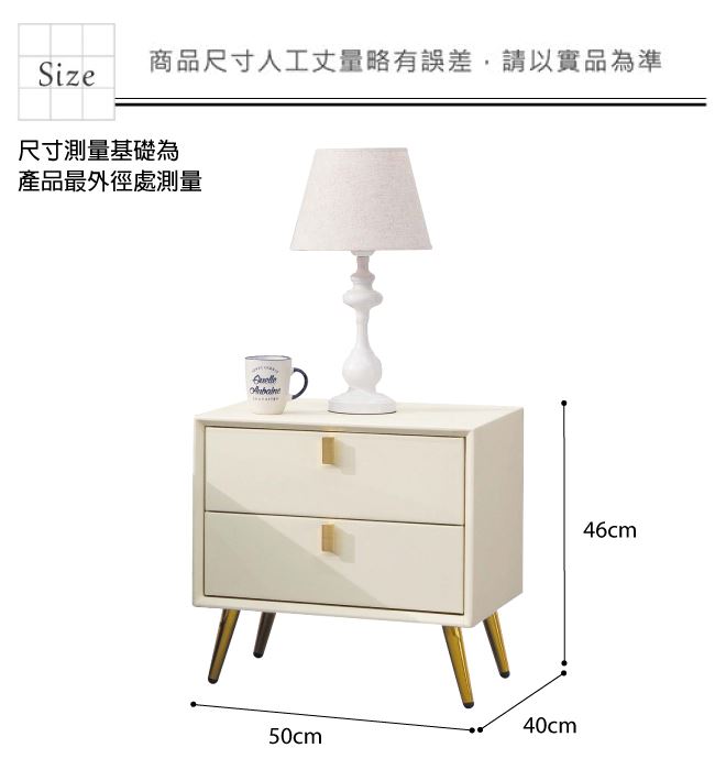 材質 | ◆產品名稱:【綠家居】努瓦克1.7尺皮革二抽床頭櫃 尺寸:(寬)50x(深)40(高)46/公分 ◆材質: 材質:防潮MDF板材+防鏽金漆腳座+五金滑軌結構+透氣PU皮革 噴漆:防潮亮面噴漆處理