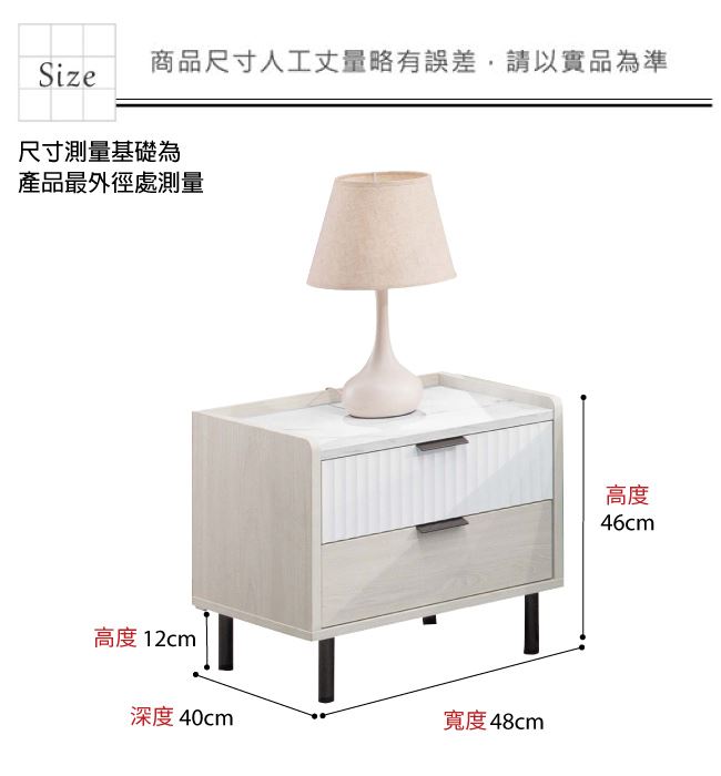 材質 | ◆產品名稱:【綠家居】剛果雙色1.6尺二抽床頭櫃 尺寸:(寬)48x(深)40(高)46/公分 ◆材質: 材質:防蛀木心板+防鏽黑漆腳座+五金滑軌結構 噴漆:防潮耐磨亮面噴漆處理 |