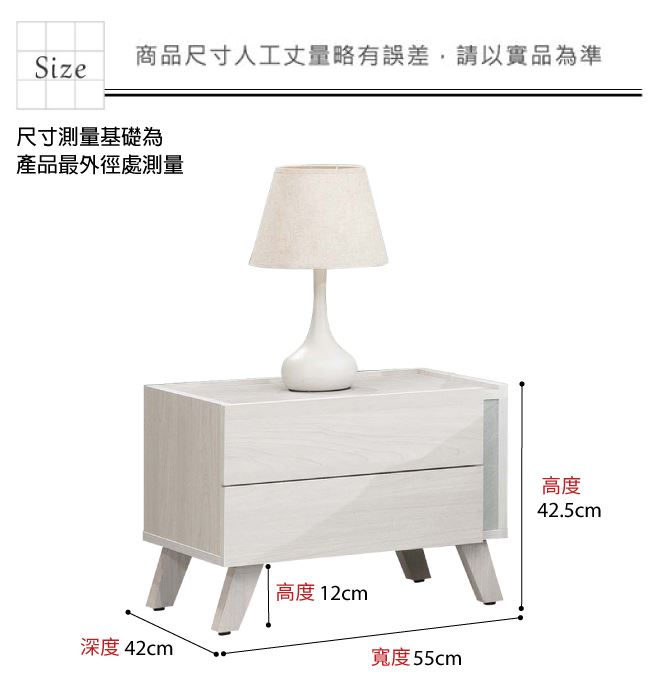 材質 | ◆產品名稱:【綠家居】利伯維1.8尺二抽床頭櫃 尺寸:(寬)55x(深)42(高)42.5/公分 ◆材質: 材質:防蛀木心板+防潮耐磨腳座+五金滑軌結構 噴漆:防潮耐磨噴漆處理 |