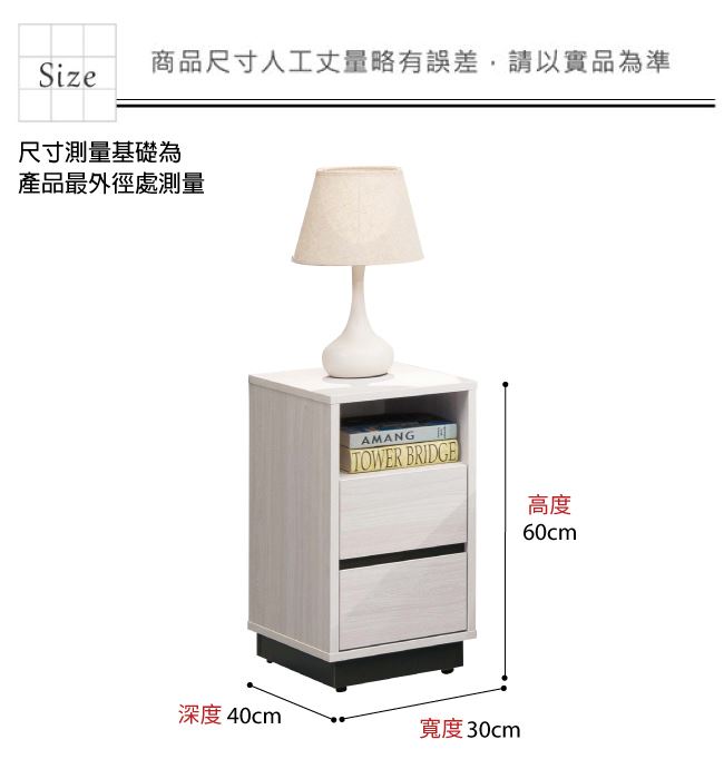 材質 | ◆產品名稱:【綠家居】剛果1尺二抽床頭櫃 尺寸:(寬)30x(深)40(高)60/公分 ◆材質: 材質:防蛀木心板+防潮防刮黑漆腳座+五金滑軌結構 噴漆:防潮耐磨噴漆處理 |