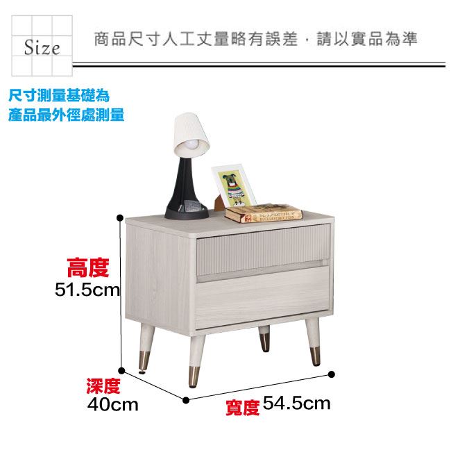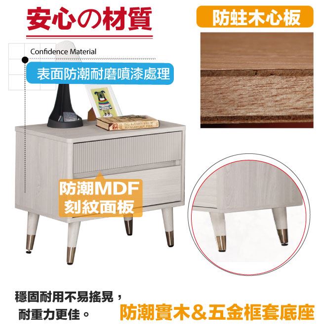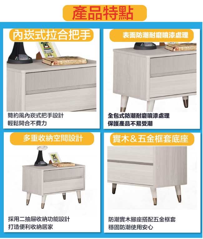 材質 | ◆產品名稱:【綠家居】摩克1.8尺二抽床頭櫃 尺寸:(寬)54.5x(深)40(高)51.5/公分 ◆材質: 材質:防蛀木心板+防潮實木&五金框套腳座+五金滑軌結構 噴漆:防潮耐磨噴漆處理 |