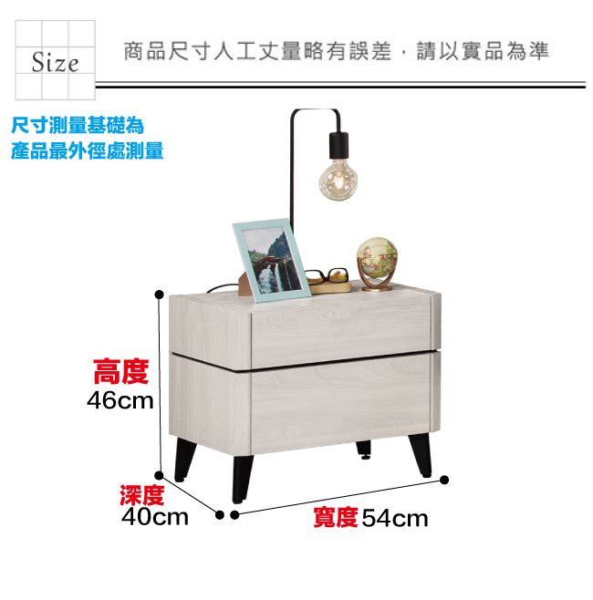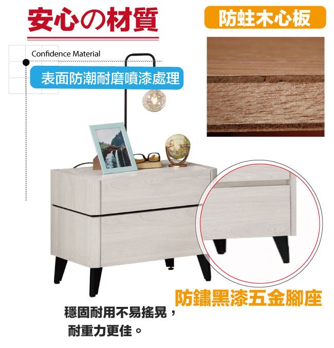 材質 | ◆產品名稱:【綠家居】卡摩帝1.7尺二抽床頭櫃 尺寸:(寬)54x(深)40(高)46/公分 ◆材質: 材質:防蛀木心板+防鏽黑漆五金腳座+五金滑軌結構 噴漆:防潮耐磨噴漆處理 |