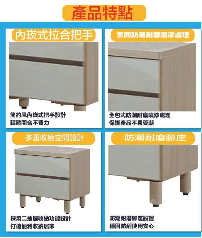 商 品 介 紹 | 【綠家居】馬蘭1.3尺二抽床頭櫃 白榆木紋色系+現代簡約風格+安心材質製造,使用放心+搭配居家更便利,整體採用防蛀木心板+防潮耐磨腳座+五金滑軌結構等材質搭配外層採用優莉坦耐磨全包式噴漆處理 ,採用二抽屜+開放式桌面等收納空間設計,全由專人配送到家,專業安心服務,替你省下更多時間! 【商品特色】 白榆木紋色系+現代簡約風格+安心材質製造,使用放心+搭配居家更便利 防蛀木心板+防潮耐磨腳座+五金滑軌結構等材質 採用二抽屜+開放式桌面等收納空間設計 此商品不需要DIY組立,此商品為組立後之成品 品質保證、專業設計、貼心服務 全由專人配送到家,專業安心服務,替您省下更多時間