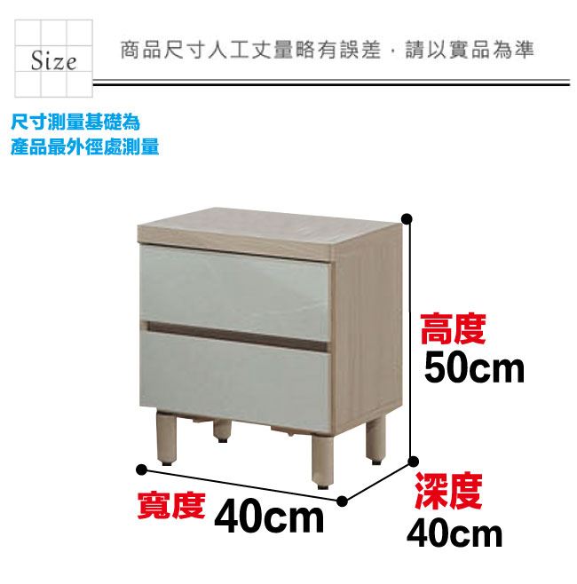 材質 | ◆產品名稱:【綠家居】馬蘭1.3尺二抽床頭櫃 尺寸:(寬)40x(深)40(高)50/公分 ◆材質: 材質:防蛀木心板+防潮耐磨腳座+五金滑軌結構 噴漆:防潮耐磨噴漆處理 |