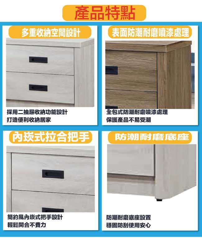 商 品 介 紹 | 【綠家居】法澤1.6尺二抽床頭櫃(二色可選) 二色可選+現代簡約風格+安心材質製造,使用放心+搭配居家更便利,整體採用防蛀木心板+防潮耐磨底座+五金滑軌結構等安心材質製造搭配外層採用防潮耐磨噴漆處理 ,採用二抽屜+開放式收納等收納空間設計,全由專人配送到家,專業安心服務,替你省下更多時間! 【商品特色】 二色可選+現代簡約風格+安心材質製造,使用放心+搭配居家更便利 防蛀木心板+防潮耐磨底座+五金滑軌結構等安心材質製造 採用二抽屜+開放式收納等收納空間設計 此商品不需要DIY組立,此商品為組立後之成品 品質保證、專業設計、貼心服務 全由專人配送到家,專業安心服務,替您省下更多時間