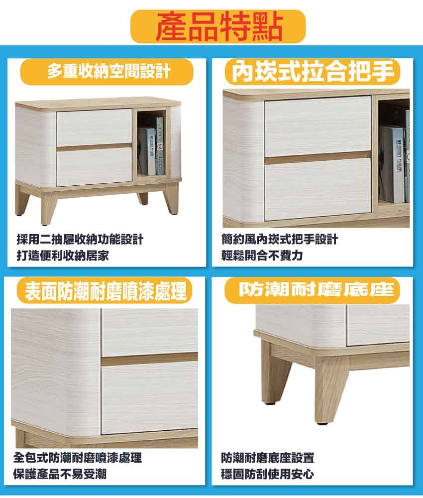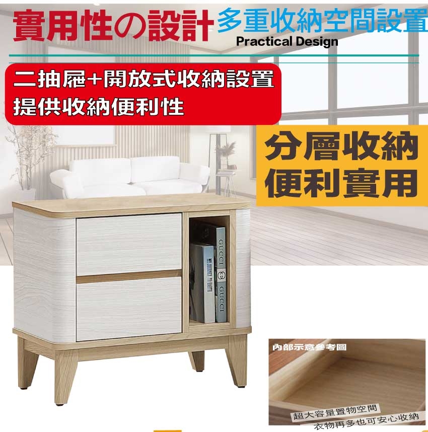 搭配採用二抽屜+開放層格等收納空間設計