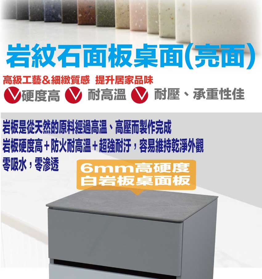 採用防潮MDF板+烤漆鐵製腳座+五金滑軌結構+6mm高硬度岩板桌面板等安心材質製造
