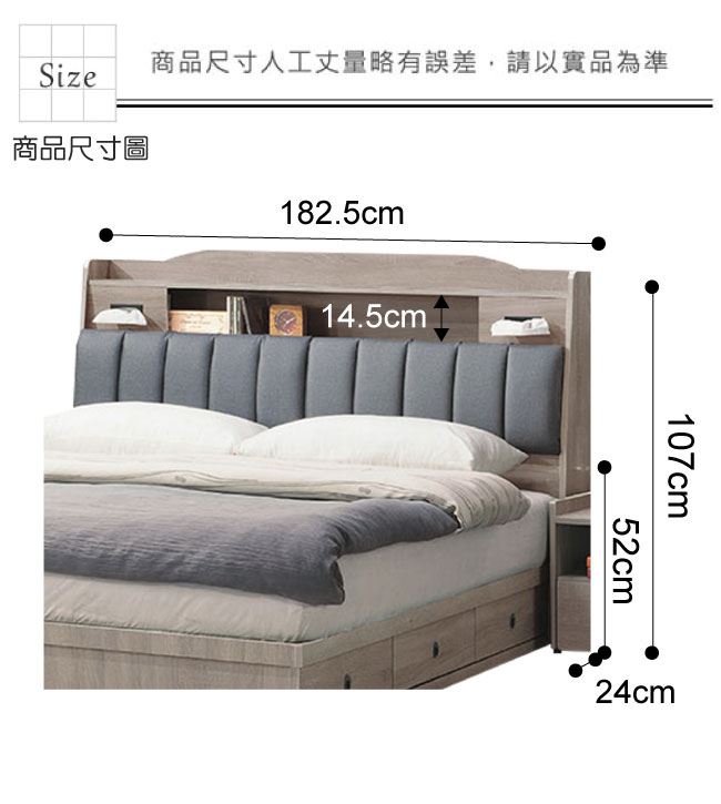 材質 | ◆產品名稱:【綠家居】 愛德華 現代6尺雙人加大貓抓皮革床頭箱(不含床底+不含床墊) 產品尺寸: 床頭尺寸:(寬)182.5x(深)24x(高)107/公分 ◆材質: 材質:防蛀木心板+耐刮貓抓皮革+高密度泡棉 塗漆:優利坦全包式耐磨噴漆處理 |