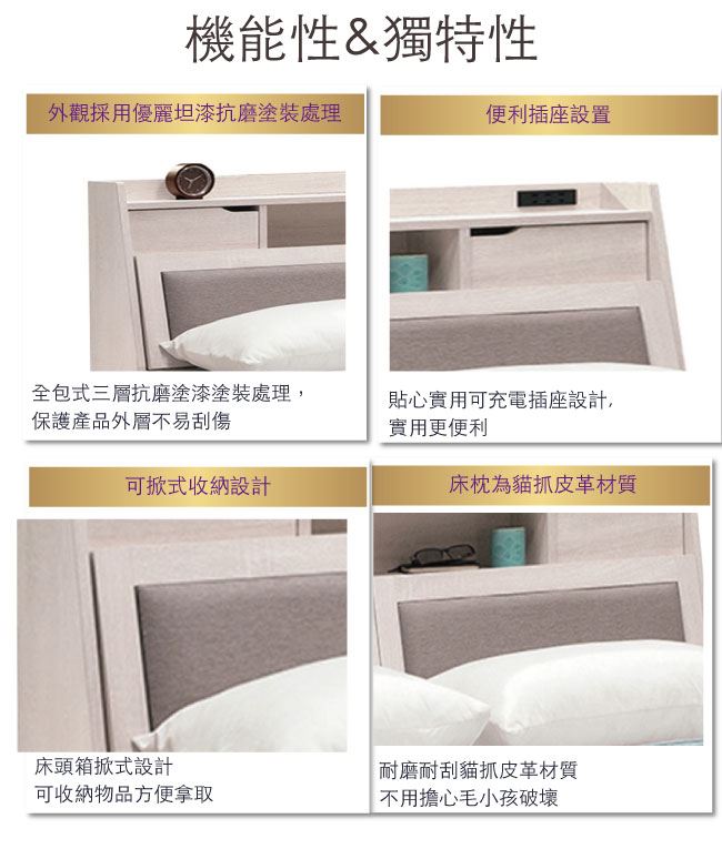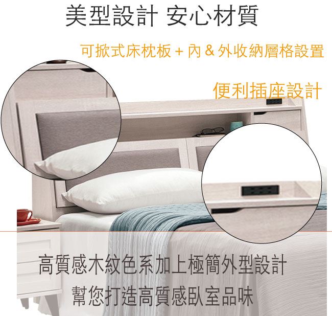 - 可掀式床枕板+開放&隱藏式收納