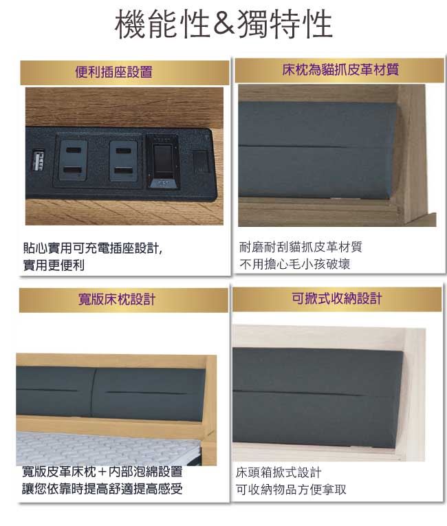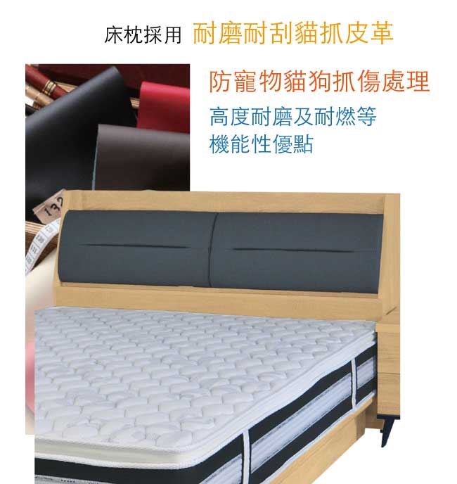 商品介紹 | 【綠家居】芬米 時尚5尺雙人貓抓皮革床頭箱(四色可選+不含床底+不含床墊) 四色可選+現代簡約風格+安心材質製造,整體採用防蛀木心板+耐刮貓抓皮革+高密度泡棉等安心材質製造,產品外層採用防潮耐磨噴漆處理搭配採用可掀式床枕板+內&外開放層格+便利插座設置等收納空間設計,全由專人配送到家,專業安心服務,替你省下更多時間! 【商品特色】 四色可選+現代簡約風格+安心材質製造,使用放心+搭配居家更便利 採用防蛀木心板+耐刮貓抓皮革+高密度泡棉等安心材質製造 產品外層採用防潮耐磨噴漆處理 搭配採用可掀式床枕板+內&外開放層格+便利插座設置等收納空間設計 此商品不需要DIY組立,此商品為組立後之成品 品質保證、專業設計、貼心服務 全由專人配送到家,專業安心服務,替您省下更多時間 |