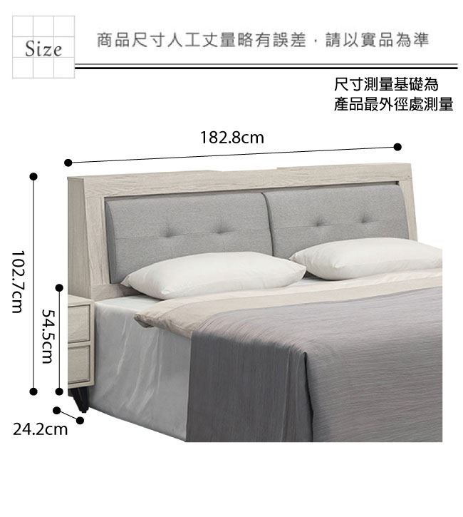 材質 | ◆產品名稱: 【綠家居】提菲芮 現代6尺雙人加大貓抓皮革床頭箱(不含床底+不含床墊) 產品尺寸: 木紋雙色 床頭尺寸:(寬)182.8(深)24.2x(高)102.7/公分 ◆材質: 材質:防蛀木心板+耐刮貓抓皮革+高密度泡棉 塗漆:優利坦全包式耐磨噴漆處理