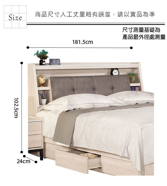 材質 | ◆產品名稱: 【綠家居】海多娜 橡木紋6尺雙人加大棉麻布床頭箱(不含床底+不含床墊) 床頭箱尺寸:(寬)181.5x(深)24(高)102.5/公分 ◆材質: 材質:防蛀木心板+透氣棉麻布+高密度泡棉 噴漆:防潮耐磨噴漆處理