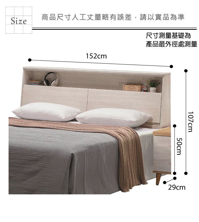 材質 | ◆產品名稱: 【綠家居】納卡西 5尺雙人淺橡色床頭箱(不含床底+不含床墊) 床頭箱尺寸:(寬)152x(深)29(高)107/公分 ◆材質: 材質:防蛀木心板 噴漆:防潮耐磨噴漆處理