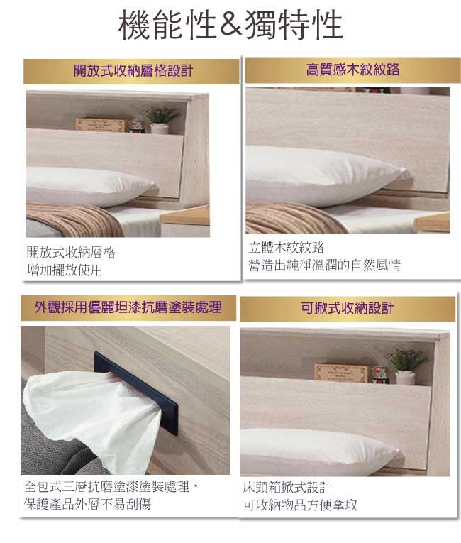 商品 介紹 | 【綠家居】納卡西 6尺雙人加大淺橡色床頭箱(不含床底+不含床墊) 淺橡木紋色系+現代簡約風格+安心材質製造,整體採用防蛀木心板安心材質製造,產品外層採用防潮耐磨噴漆處理搭配採用可掀式床枕板+內&外開放層格等收納空間設計,全由專人配送到家,專業安心服務,替你省下更多時間! 【商品特色】 淺橡木紋色系+現代簡約風格+安心材質製造,使用放心+搭配居家更便利 採用防蛀木心板安心材質製造 產品外層採用防潮耐磨噴漆處理 搭配採用可掀式床枕板+內&外開放層格等收納空間設計 此商品不需要DIY組立,此商品為組立後之成品 品質保證、專業設計、貼心服務 全由專人配送到家,專業安心服務,替您省下更多時間 |