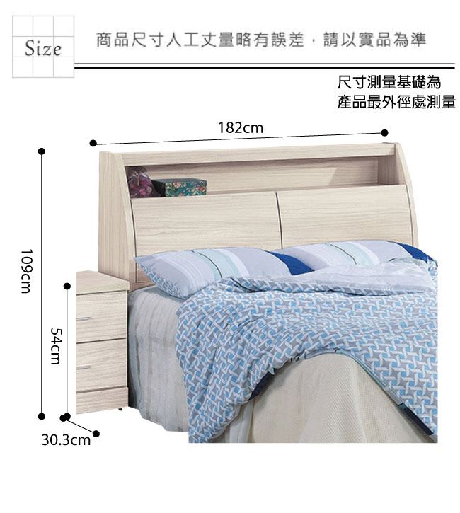 材質 | ◆產品名稱: 【綠家居】福瑞 梣木紋6尺雙人加大床頭箱(不含床底+不含床墊) 床頭箱尺寸:(寬)182x(深)30.3(高)109/公分 ◆材質: 材質:防蛀木心板 噴漆:防潮耐磨噴漆處理