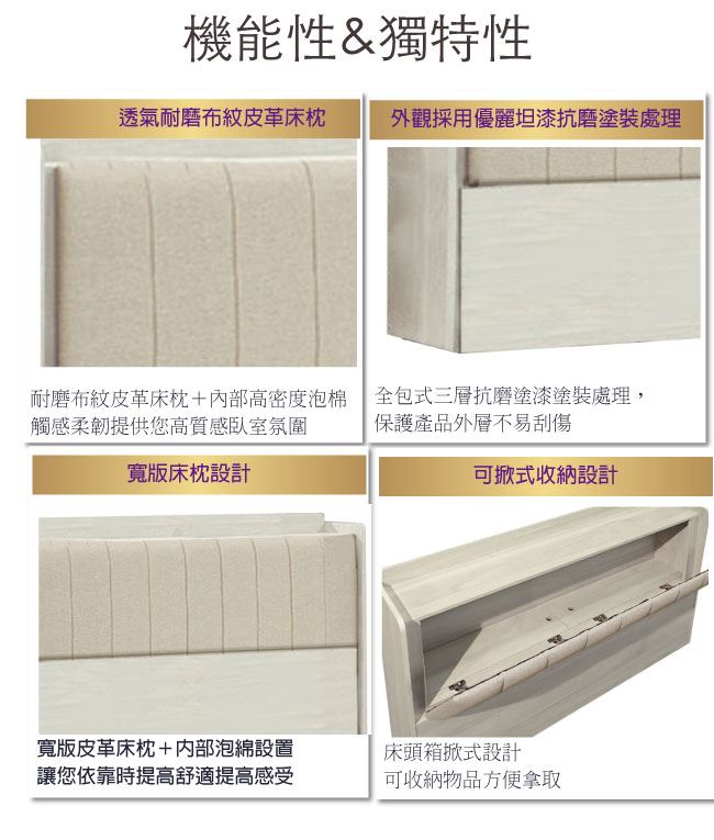 商 品 介 紹 | 【綠家居】卡夏淺橡5尺雙人貓抓皮革床頭箱(不含床底+不含床墊) 淺橡木紋色系+現代簡約風格+安心材質製造,整體採用防蛀木心板+防刮貓抓皮革+高密度泡棉等安心材質製造,產品外層採用防潮耐磨噴漆處理搭配採用可掀式床枕板+內&外開放層格等收納空間設計,全由專人配送到家,專業安心服務,替你省下更多時間! 【商品特色】 淺橡木紋色系+現代簡約風格+安心材質製造,使用放心+搭配居家更便利 採用防蛀木心板+防刮貓抓皮革+高密度泡棉等安心材質製造 產品外層採用防潮耐磨噴漆處理 搭配採用可掀式床枕板+內&外開放層格等收納空間設計 此商品不需要DIY組立,此商品為組立後之成品 品質保證、專業設計、貼心服務 全由專人配送到家,專業安心服務,替您省下更多時間