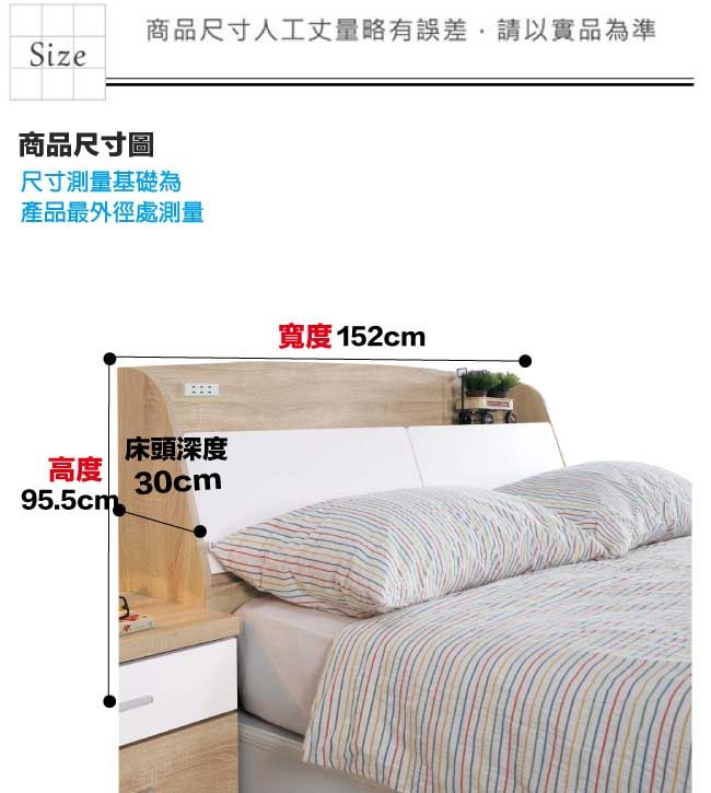 材質 | ◆產品名稱:【綠家居】哈路雙色5尺雙人可收納床頭箱(不含床底+不含床墊) 床頭尺寸:(寬)152x(深)30(高)95.5/公分 ◆材質: 材質:防蛀木心板 噴漆:防潮耐磨&亮面噴漆處理