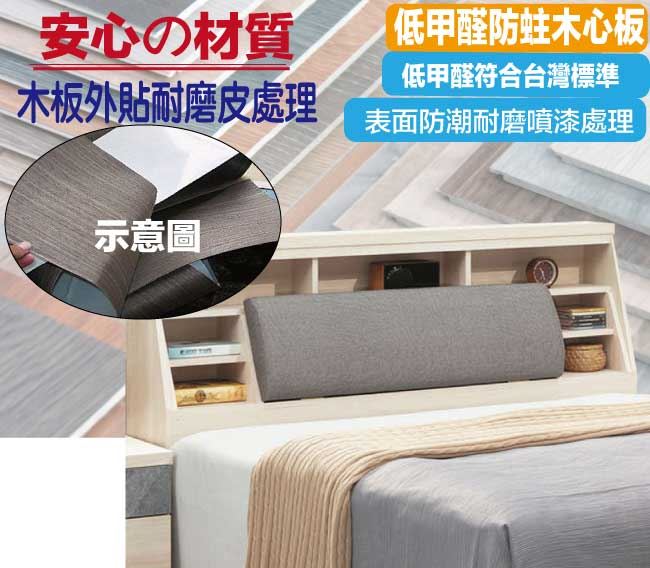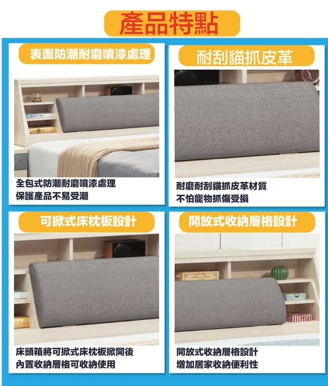 商 品 介 紹 | 【綠家居】夏亞6尺雙人加大貓抓皮革床頭箱(不含床底+不含床墊) 木紋雙色系+現代簡約風格+安心材質製造,整體採用防蛀木心板+耐磨貓抓皮革+高密度泡棉等安心材質製造,產品外層採用防潮耐磨噴漆處理搭配採用床頭箱可掀式床枕板+內外開放層格等收納空間設計,全由專人配送到家,專業安心服務,替你省下更多時間! 【商品特色】 木紋雙色系+現代簡約風格+安心材質製造,使用放心+搭配居家更便利 採用防蛀木心板+耐磨貓抓皮革+高密度泡棉等安心材質製造 產品外層採用防潮耐磨噴漆處理 搭配採用床頭箱可掀式床枕板+內外開放層格等收納空間設計 此商品不需要DIY組立,此商品為組立後之成品 品質保證、專業設計、貼心服務 全由專人配送到家,專業安心服務,替您省下更多時間