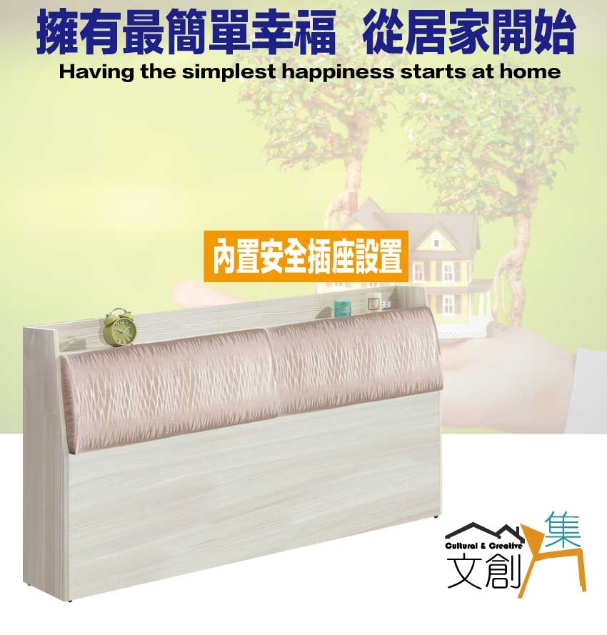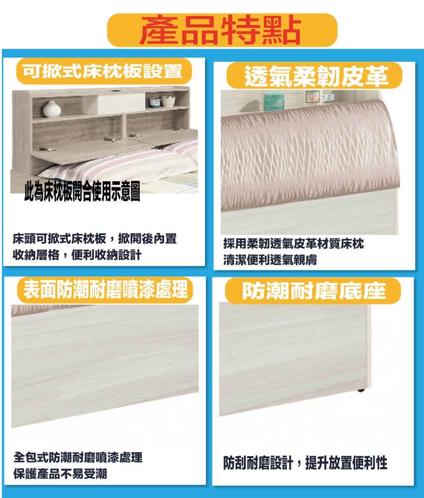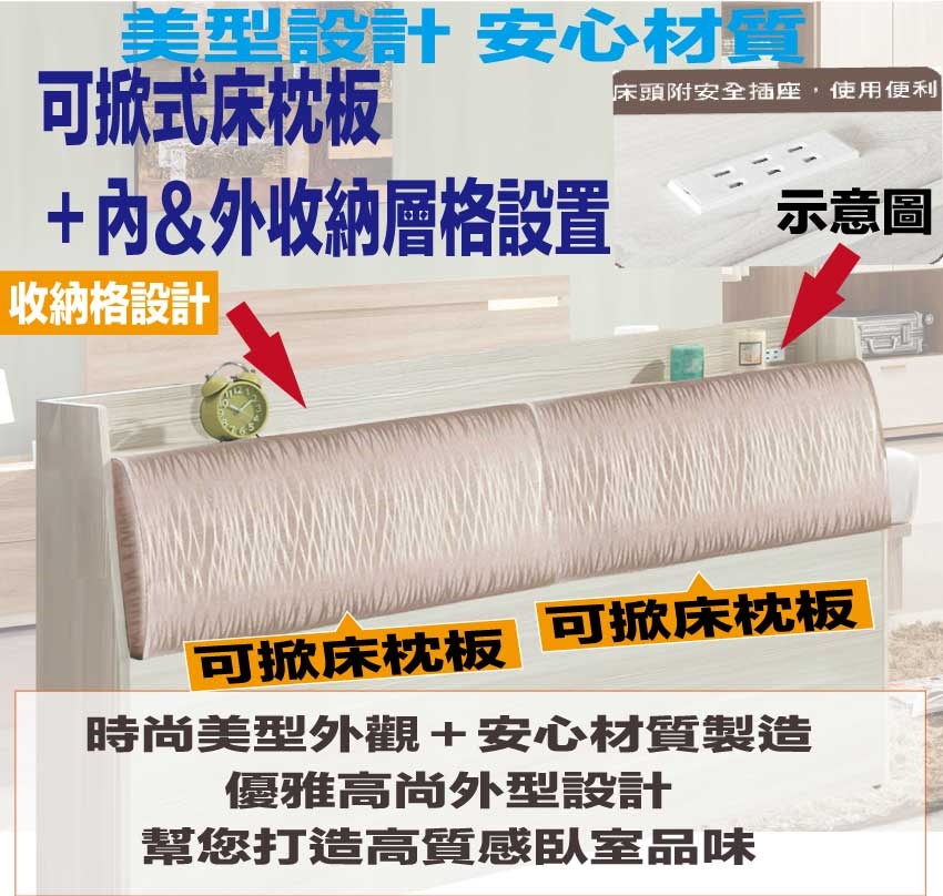搭配床頭可掀式床枕板+內&外開放層格+便利插座設置等收納空間設計