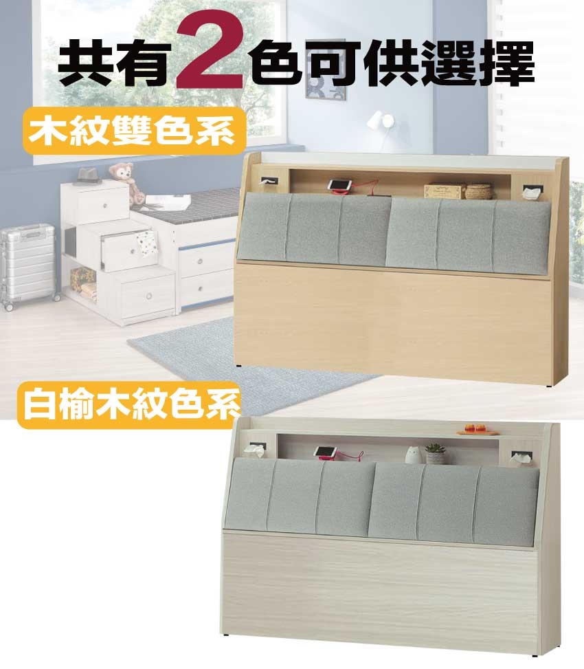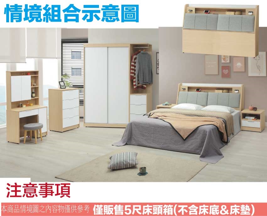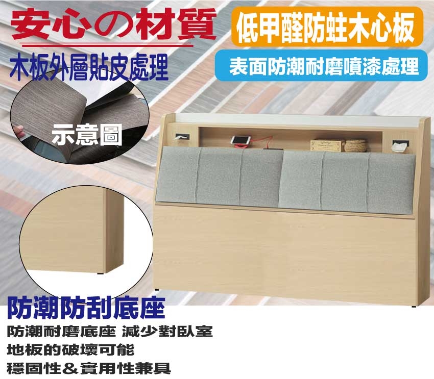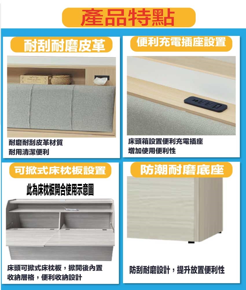 搭配床頭採用可掀式床枕板+內&外收納空間+便利插座等收納空間設計