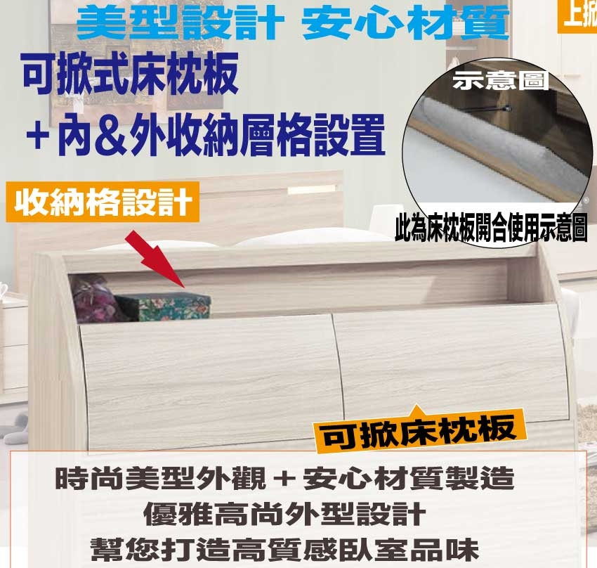 搭配床頭採用可掀式床枕板+內&外收納空間等收納空間設計