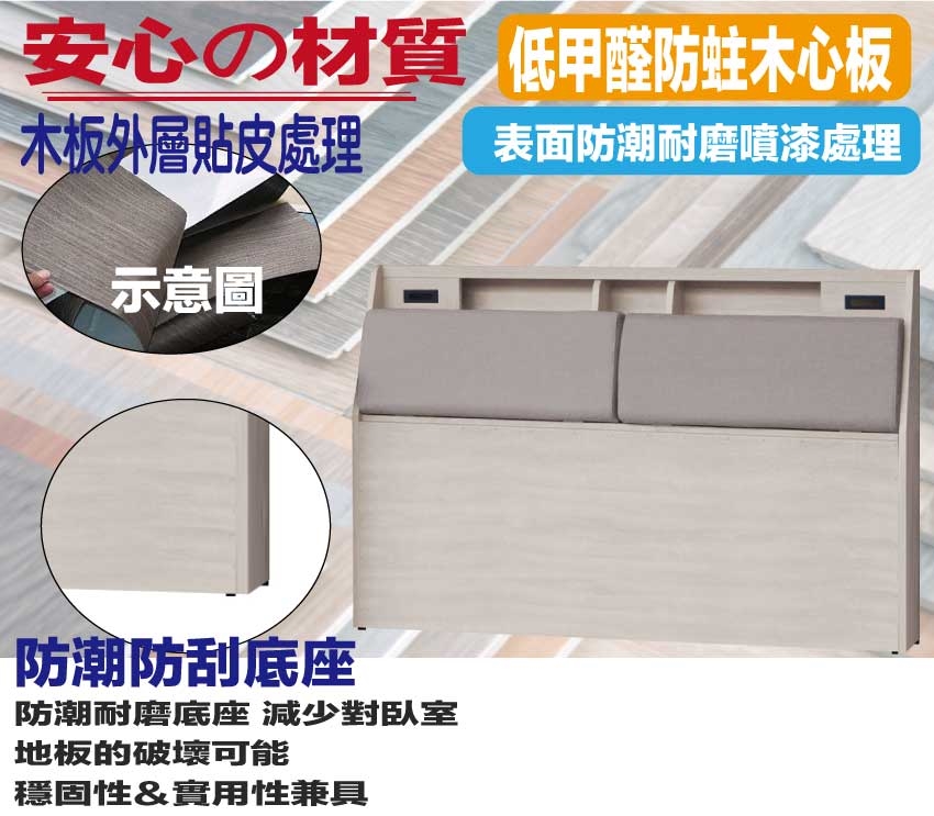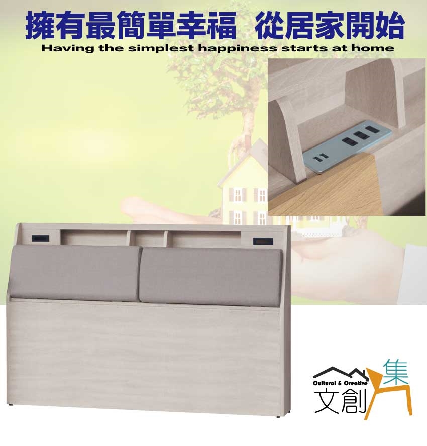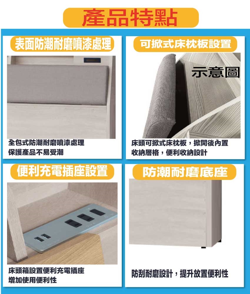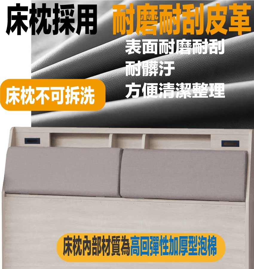 搭配床頭採用可掀式床枕板+內&外收納空間+USB便利插座等收納空間設計