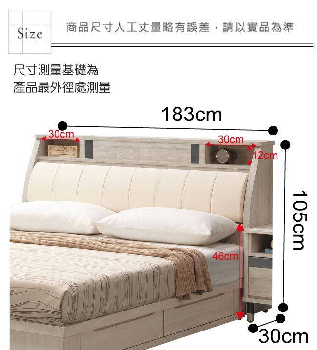 材質 | ◆產品名稱:【綠家居】 額爾 現代6尺雙人加大貓抓皮革床頭箱(不含床底+不含床墊) 產品尺寸: 床頭尺寸:(寬)183x(深)30x(高)105/公分 ◆材質: 材質:防蛀木心板+耐刮貓抓皮革+高密度泡棉 塗漆:優利坦全包式耐磨噴漆處理 |