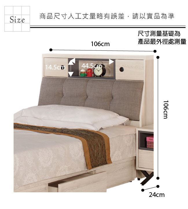 材質 | ◆產品名稱: 【綠家居】柏文 淺橡3.5尺單人棉麻布床頭箱(不含床底+不含床墊) 床頭箱尺寸:(寬)106x(深)24(高)106/公分 ◆材質: 材質:防蛀木心板+透氣棉麻布+高密度泡棉 噴漆:防潮耐磨噴漆處理