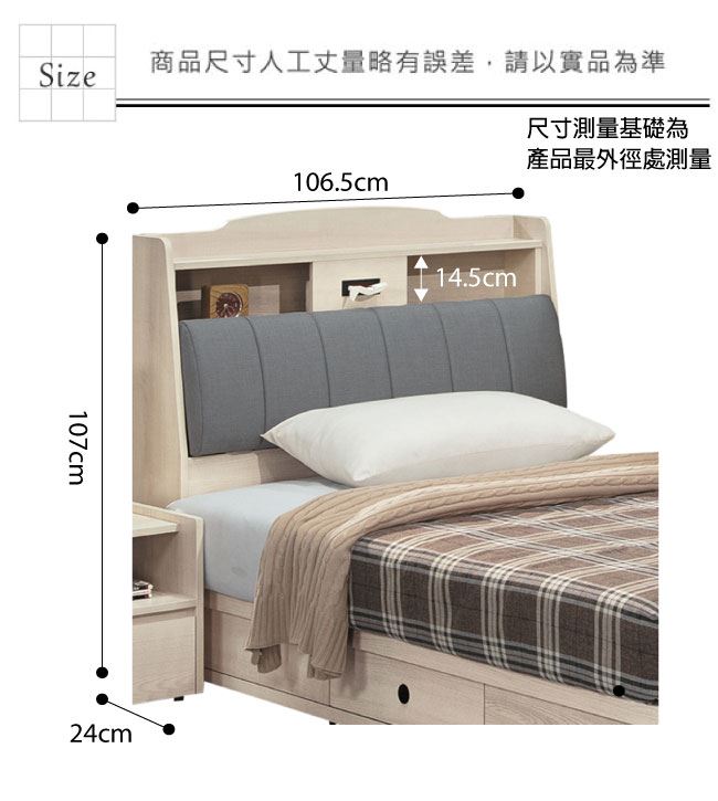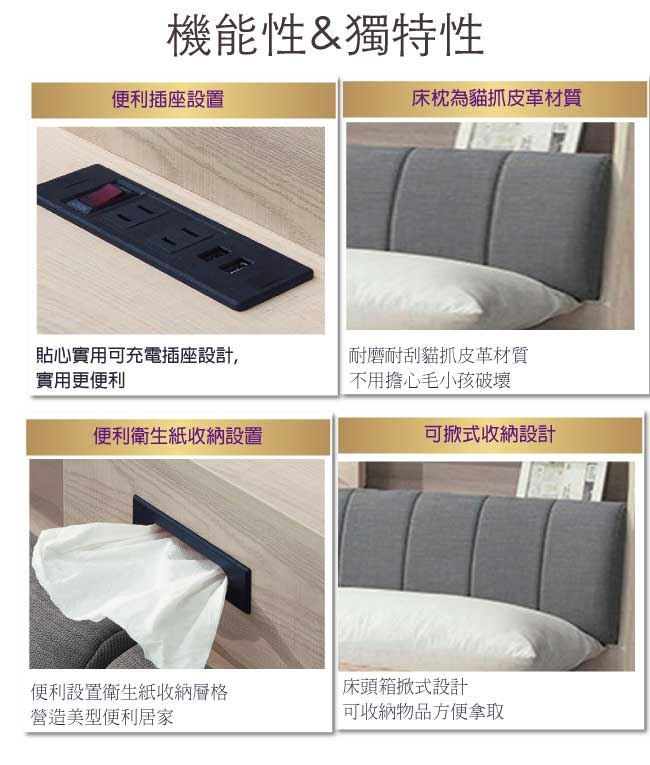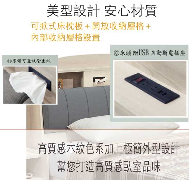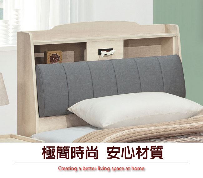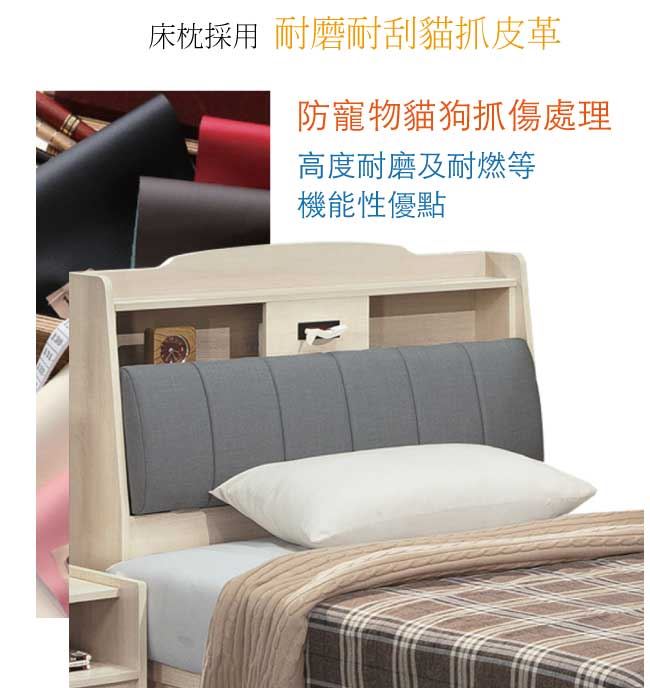 商品 介紹 | 【綠家居】卡西斯 3.5尺單人貓抓皮革床頭箱(不含床底+不含床墊) 橡木紋色系+現代簡約風格+安心材質製造,整體採用防蛀木心板+耐刮貓抓皮革+高密度泡棉等安心材質製造,產品外層採用防潮耐磨噴漆處理搭配採用可掀式床枕板+內&外開放層格+單抽格+便利插座設置+單邊開合三抽屜床底等收納空間設計,全由專人配送到家,專業安心服務,替你省下更多時間! 【商品特色】 橡木紋色系+現代簡約風格+安心材質製造,使用放心+搭配居家更便利 採用防蛀木心板+耐刮貓抓皮革+高密度泡棉等安心材質製造 產品外層採用防潮耐磨噴漆處理 搭配採用可掀式床枕板+內&外開放層格+單抽格+便利插座設置+單邊開合三抽屜床底等收納空間設計 此商品不需要DIY組立,此商品為組立後之成品 品質保證、專業設計、貼心服務 全由專人配送到家,專業安心服務,替您省下更多時間 |