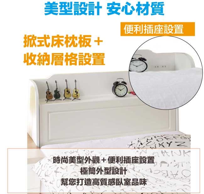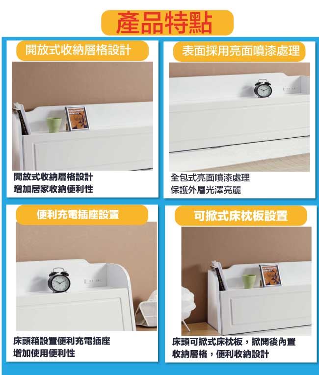 商品 介紹 | 【綠家居】路可簡約白3.5尺單人可收納床頭箱(不含床底+不含床墊) 簡約白色系+現代簡約風格+安心材質製造,整體採用防蛀木心板+防潮MDF板材等安心材質製造,產品外層採用防潮亮面噴漆處理搭配採用可掀式床板+內&外開放層格+便利充電插座設置等收納空間設計,全由專人配送到家,專業安心服務,替你省下更多時間! 【商品特色】 簡約白色系+現代簡約風格+安心材質製造,使用放心+搭配居家更便利 採用防蛀木心板+防潮MDF板材等安心材質製造 產品外層採用防潮亮面噴漆處理 搭配採用可掀式床板+內&外開放層格+便利充電插座設置等收納空間設計 此商品不需要DIY組立,此商品為組立後之成品 品質保證、專業設計、貼心服務 全由專人配送到家,專業安心服務,替您省下更多時間 |