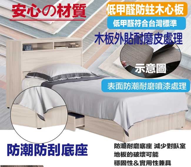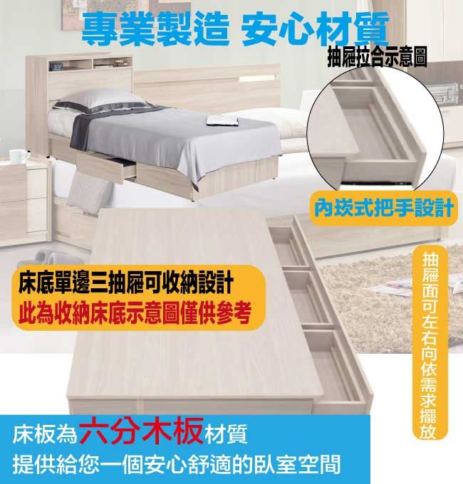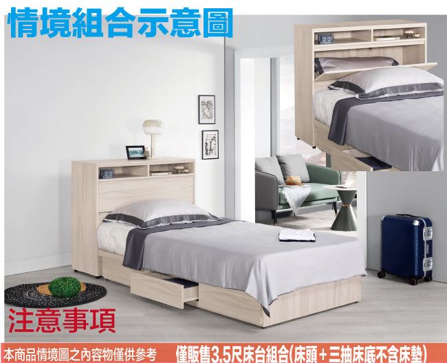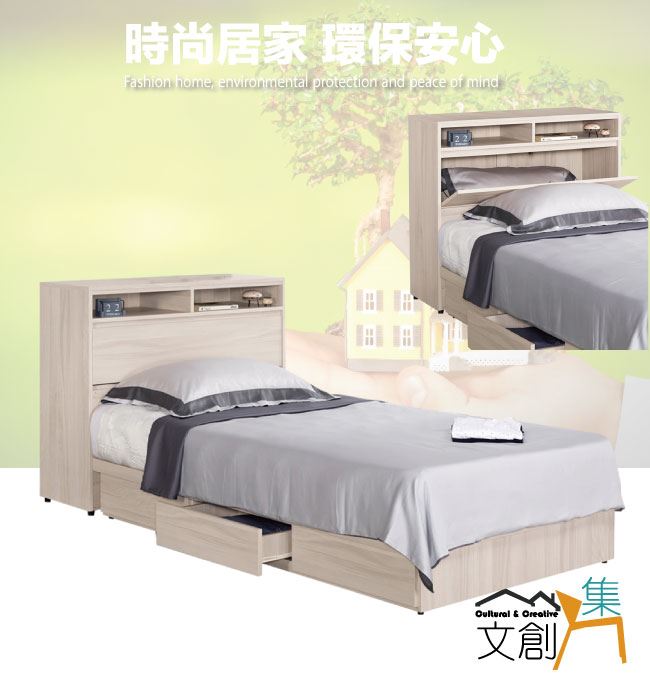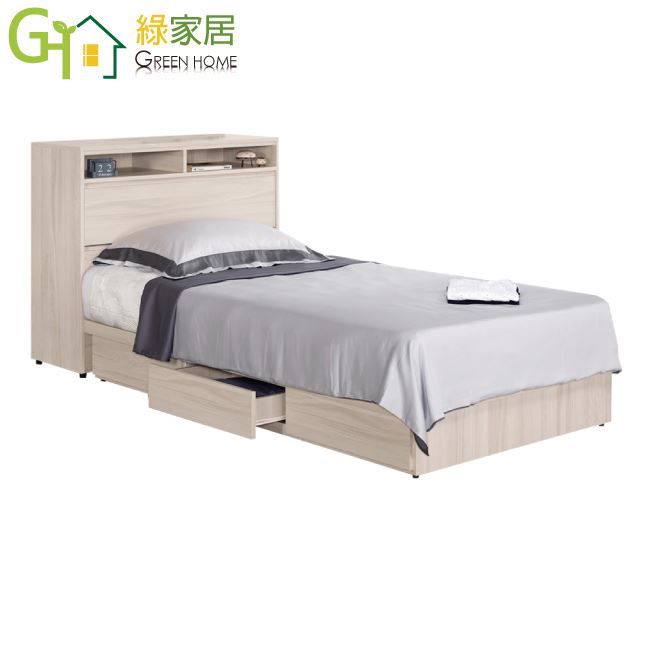 商 品 介 紹 | 【綠家居】亨利3.5尺單人三抽床台組合(床頭箱+三抽床底+不含床墊) 淺橡木紋色系+現代簡約風格+安心材質製造,整體採用防蛀木心板+六分木床板+防潮耐磨腳座等安心材質製造,產品外層採用防潮耐磨噴漆處理搭配採用可掀式床枕板+內&外收納空間+床底座單邊開合三抽屜等收納空間設計,全由專人配送到家,專業安心服務,替你省下更多時間! 【商品特色】 淺橡木紋色系+現代簡約風格+安心材質製造,使用放心+搭配居家更便利 採用防蛀木心板+六分木床板+防潮耐磨腳座等安心材質製造 產品外層採用防潮耐磨噴漆處理 搭配採用可掀式床枕板+內&外收納空間+床底座單邊開合三抽屜等收納空間設計 此商品不需要DIY組立,此商品為組立後之成品 品質保證、專業設計、貼心服務 全由專人配送到家,專業安心服務,替您省下更多時間