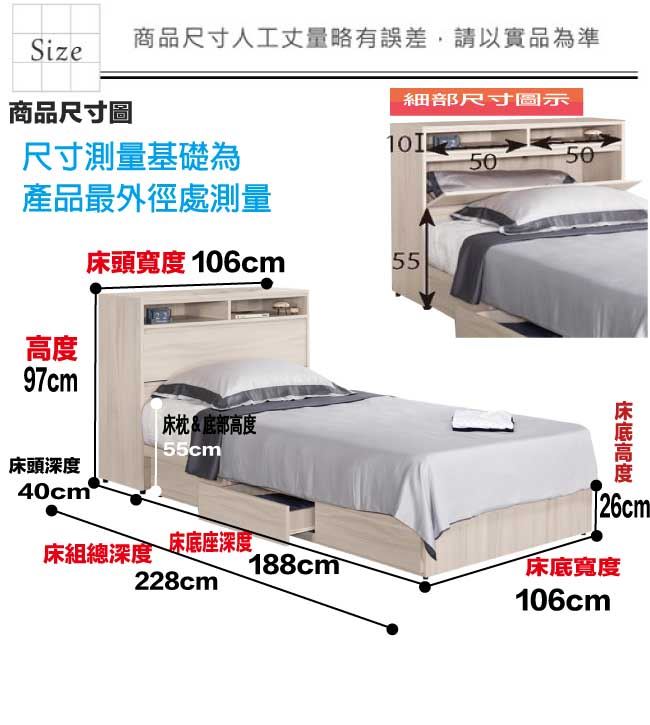 材質 | ◆產品名稱:【綠家居】亨利3.5尺單人三抽床台組合(床頭箱+三抽床底+不含床墊) 床頭衣櫃尺寸:(寬)106x(深)40(高)97/公分 床底尺寸:(寬)106x(深)188(高)26/公分 床台組合尺寸:(寬)106x(深)228(高)97/公分 ◆材質: 材質:防蛀木心板+六分木床板+防潮耐磨腳座 噴漆:防潮耐磨噴漆處理 |