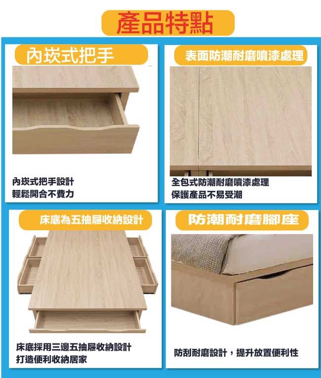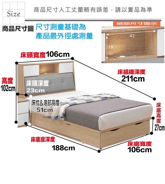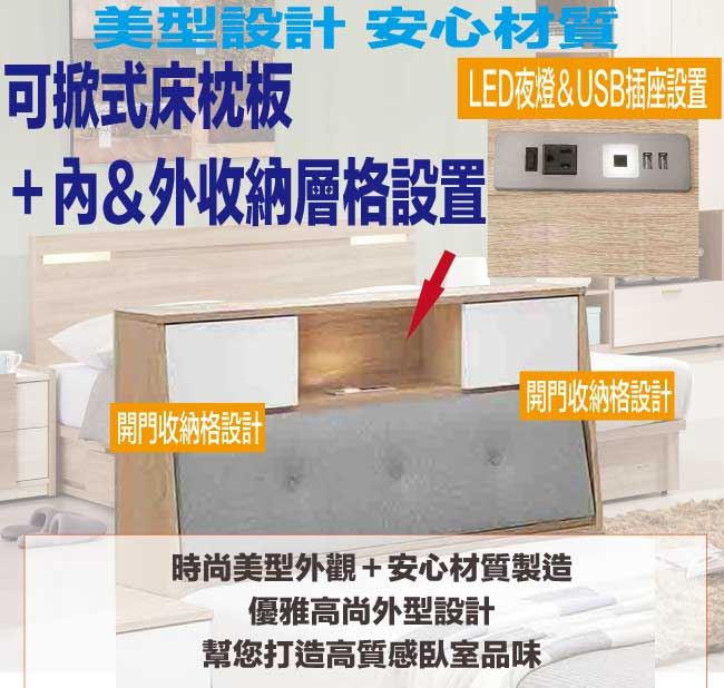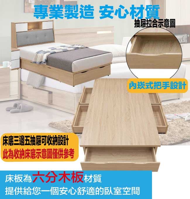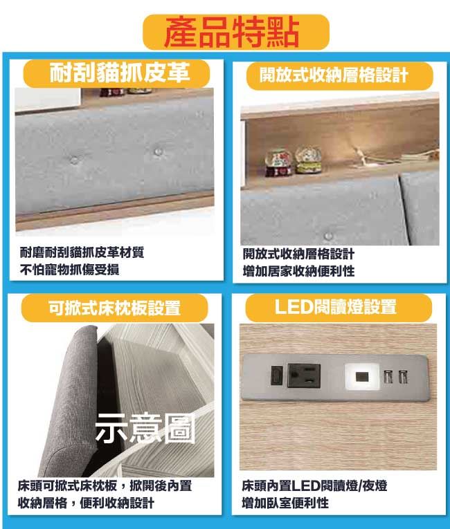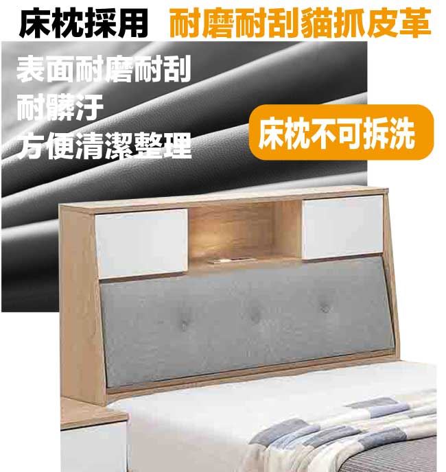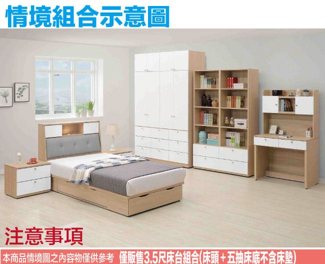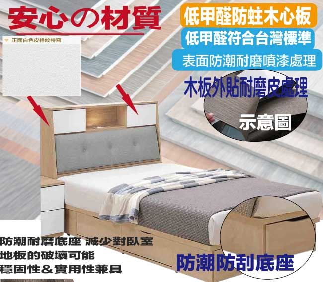 商 品 介 紹 | 【綠家居】愛坦雙色3.5尺單人貓抓皮革五抽床台組合(床頭箱+五抽床底+不含床墊) 木紋雙色系+現代簡約風格+安心材質製造,整體採用防蛀木心板+六分木床板+防潮耐磨腳座+耐磨貓抓皮革+高彈力泡棉+白色面板採用皮革紋路貼皮處理等安心材質製造,產品外層採用防潮耐磨噴漆處理搭配採用床頭箱可掀式床枕板+內&外收納空間+LED夜燈&插座設置+床底座三邊開合五抽屜等收納空間設計,全由專人配送到家,專業安心服務,替你省下更多時間! 【商品特色】 木紋雙色系+現代簡約風格+安心材質製造,使用放心+搭配居家更便利 採用防蛀木心板+六分木床板+防潮耐磨腳座+耐磨貓抓皮革+高彈力泡棉+白色面板採用皮革紋路貼皮處理等安心材質製造 產品外層採用防潮耐磨噴漆處理 搭配採用床頭箱可掀式床枕板+內&外收納空間+LED夜燈&插座設置+床底座三邊開合五抽屜等收納空間設計 此商品不需要DIY組立,此商品為組立後之成品 品質保證、專業設計、貼心服務 全由專人配送到家,專業安心服務,替您省下更多時間