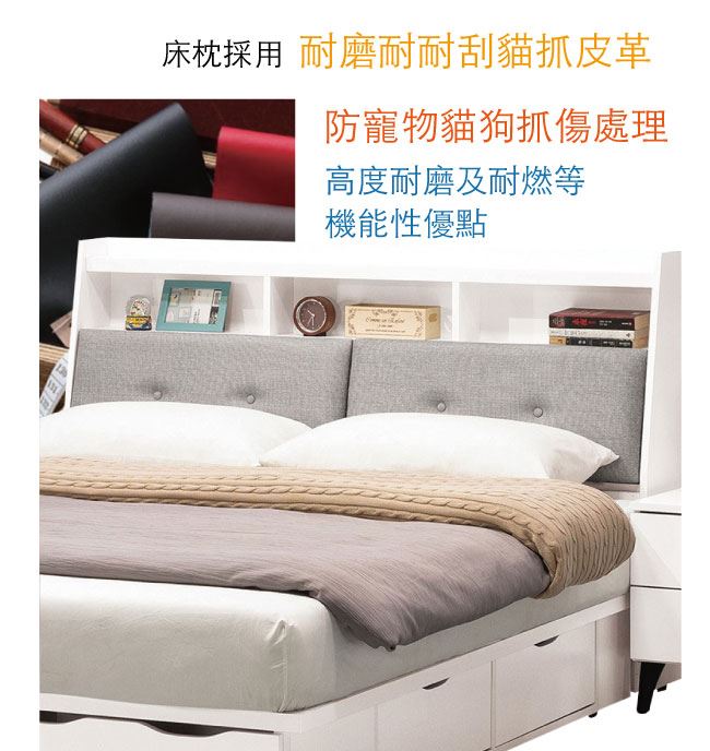 商品介紹 | 【綠家居】海地 現代5尺貓抓皮革雙人床頭箱(不含床底+不含床墊) 現代白色系+現代簡約風格+安心材質製造,整體採用防蛀木心板+耐刮貓抓皮革+高密度三層泡棉等安心材質製造,外層採用優利坦全包式亮面噴漆處理搭配可掀式床枕板+隱藏&開放收納層格等便利設計,全由專人配送到家,專業安心服務,替你省下更多時間! 【商品特色】 現代白色系+現代簡約風格+安心材質製造,使用放心+搭配居家更便利 採用防蛀木心板+耐刮貓抓皮革+高密度三層泡棉等安心材質製造 可掀式床枕板+隱藏&開放收納層格等便利設計 此商品不需要DIY組立,此商品為組立後之成品 品質保證、專業設計、貼心服務 全由專人配送到家,專業安心服務,替您省下更多時間 |