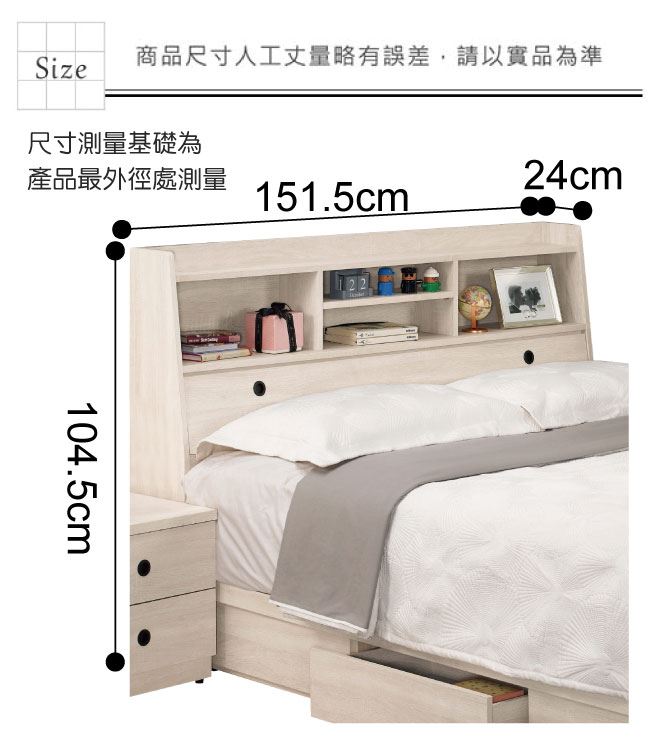 材質 | ◆產品名稱:【綠家居】金夏 現代5尺木紋雙人床頭箱(不含床底+不含床墊) 產品尺寸: 床頭尺寸:(寬)151.5x(深)24x(高)104.5/公分 ◆材質: 材質:防蛀木心板 塗漆:優利坦三層全包式耐磨塗漆塗裝處理 |