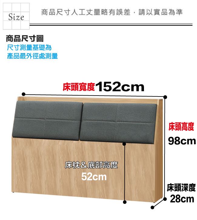 材質 | ◆產品名稱:【綠家居】約書亞5尺雙人貓抓皮革床頭箱(不含床底+不含床墊) 床頭尺寸:(寬)152x(深)28x(高)98/公分 ◆材質: 材質:防蛀木心板+防潮耐磨腳座+耐刮貓抓皮革+高回彈泡棉 噴漆:防潮耐磨噴漆處理 |