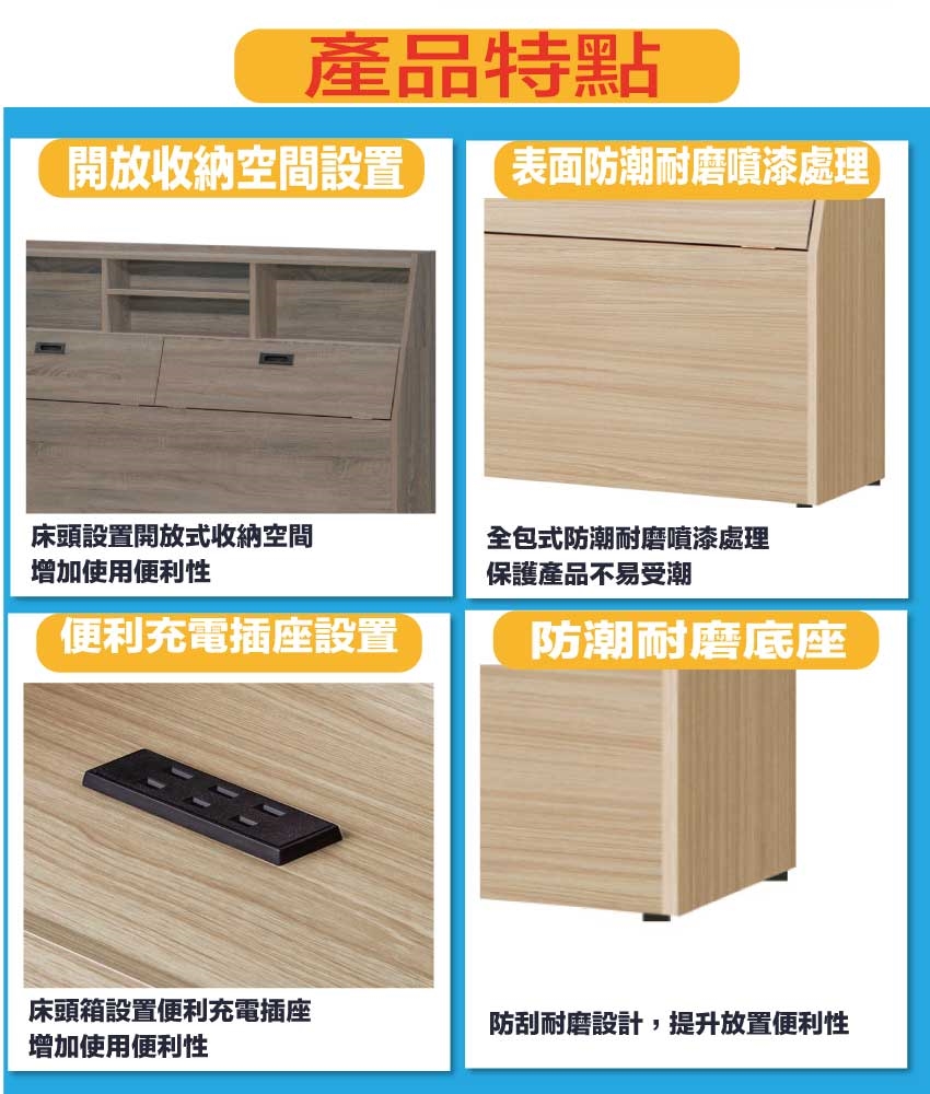 搭配床頭箱採用可掀式床枕板+內&外開放式層格+便利插座設置