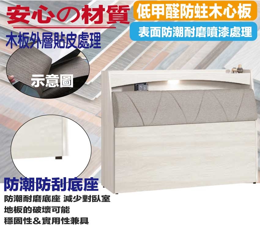 ★偏遠地區需額外加收運費,下標請先問與答詢問★ ★下訂前注意 由於商品流動較快,下訂前請先詢問是否有貨在下訂喔~★ 【綠家居】朵利5尺雙人耐刮皮夜燈床頭箱(不含床底+不含床墊) 淺橡木紋色系+安心材質製造,使用放心+搭配居家更便利,採用防蛀木心板+防潮耐磨底座+耐磨耐刮皮革+高回彈泡棉等安心材質製造 ,外層採用防潮耐磨噴漆處理搭配床頭可掀式床枕板+內&外開放層格+LED夜燈設置等收納空間設計,全由專人配送到家,專業安心服務,替你省下更多時間!