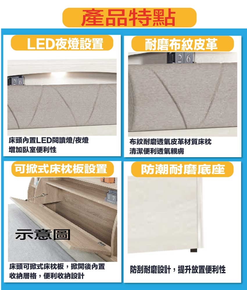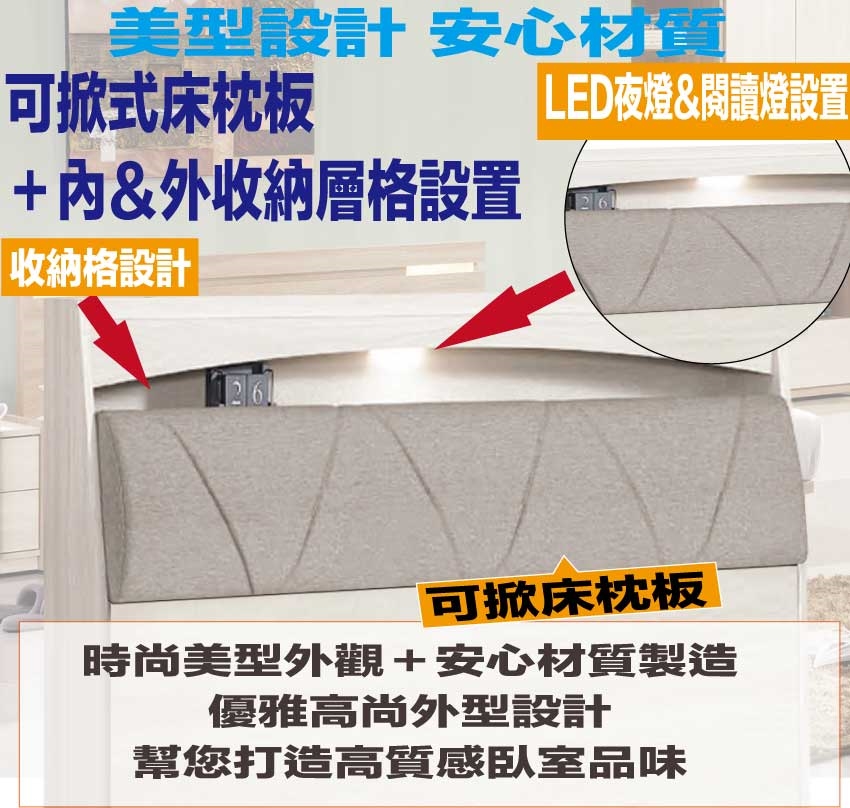 搭配床頭可掀式床枕板+內&外開放層格+LED夜燈設置等收納空間設計
