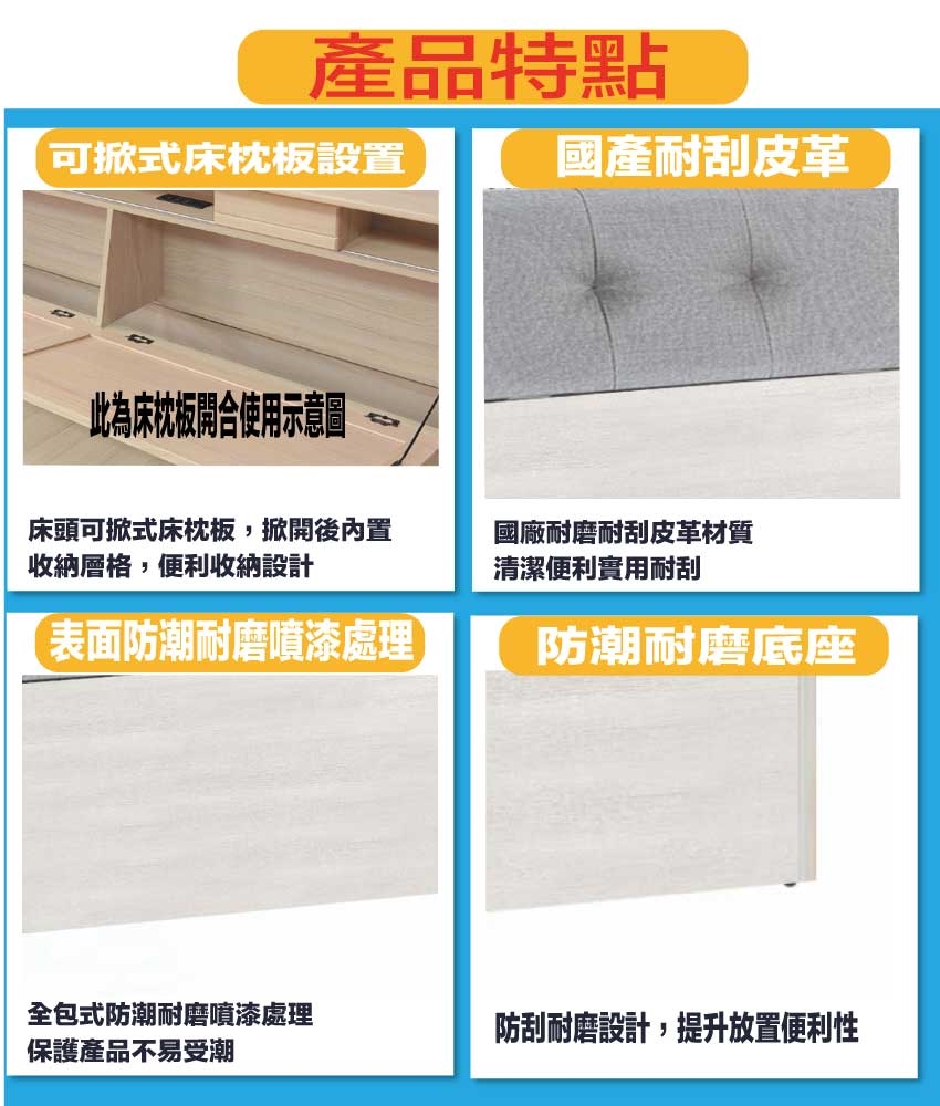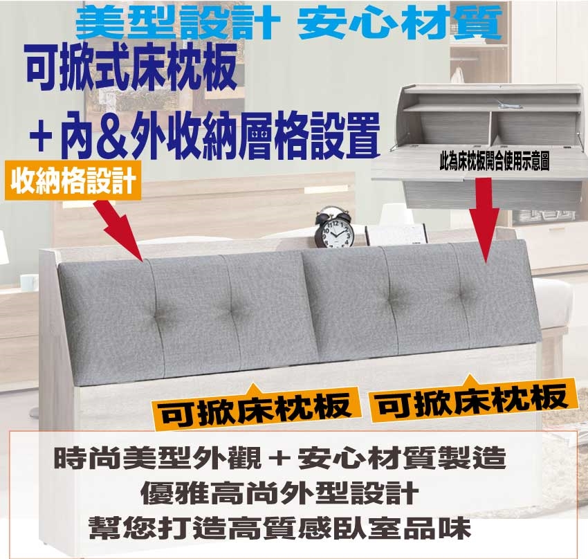 搭配床頭可掀式床枕板+內&外開放層格等收納空間設計