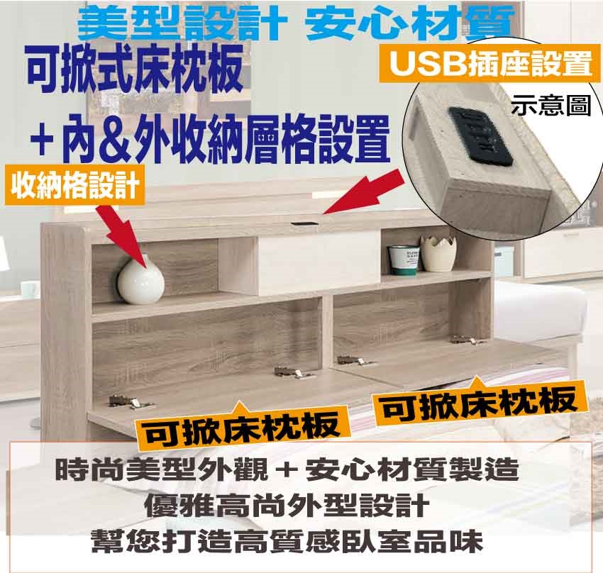搭配床頭可掀式床枕板+內&外開放層格+便利插座設置等收納空間設計