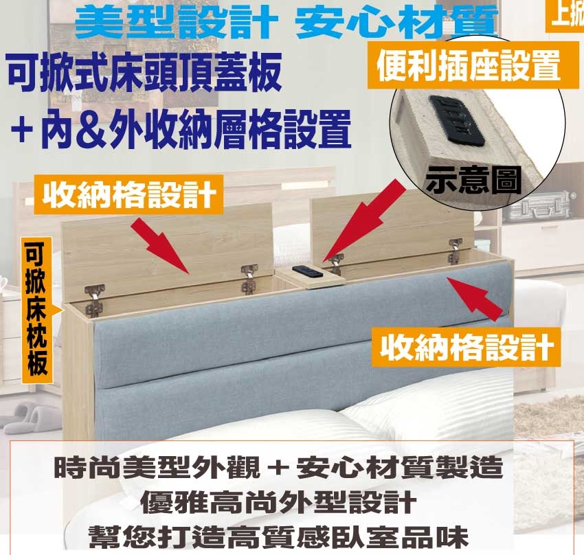 搭配床頭採用可掀式床頂板+內&外收納空間+便利插座設置等收納空間設計