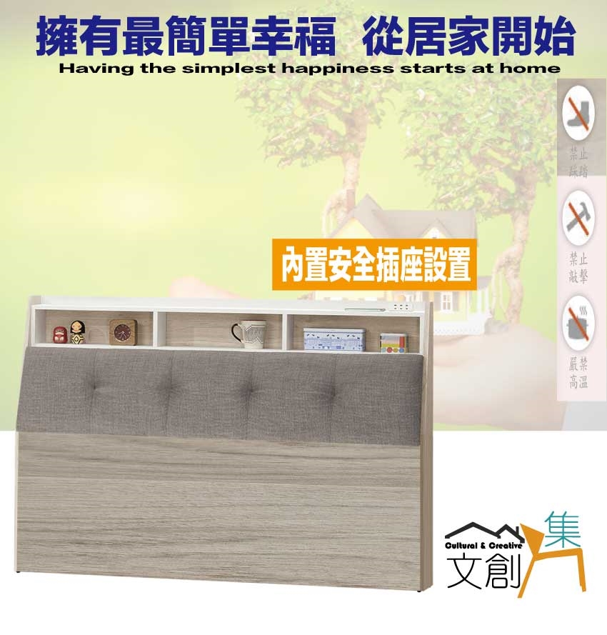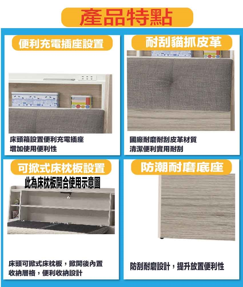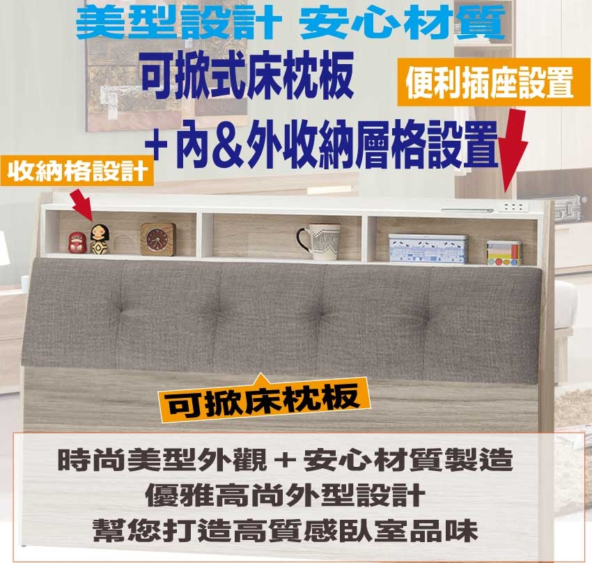搭配採用床頭箱可掀式床枕板+內&外收納層格+便利插座設置等收納空間設計