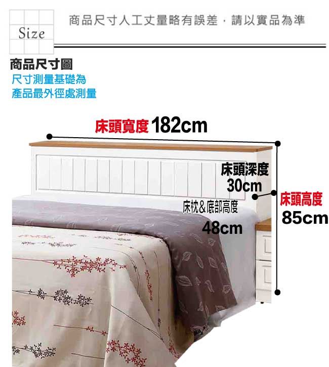 材質 | ◆產品名稱:【綠家居】麥思雙色6尺雙人加大床頭箱(不含床底+不含床墊) 床頭尺寸:(寬)182x(深)30(高)85/公分 ◆材質: 材質:防蛀木心板+防潮MDF板材(正面白色面板部份)+防潮耐磨腳座 噴漆:防潮耐磨&亮面噴漆處理 |
