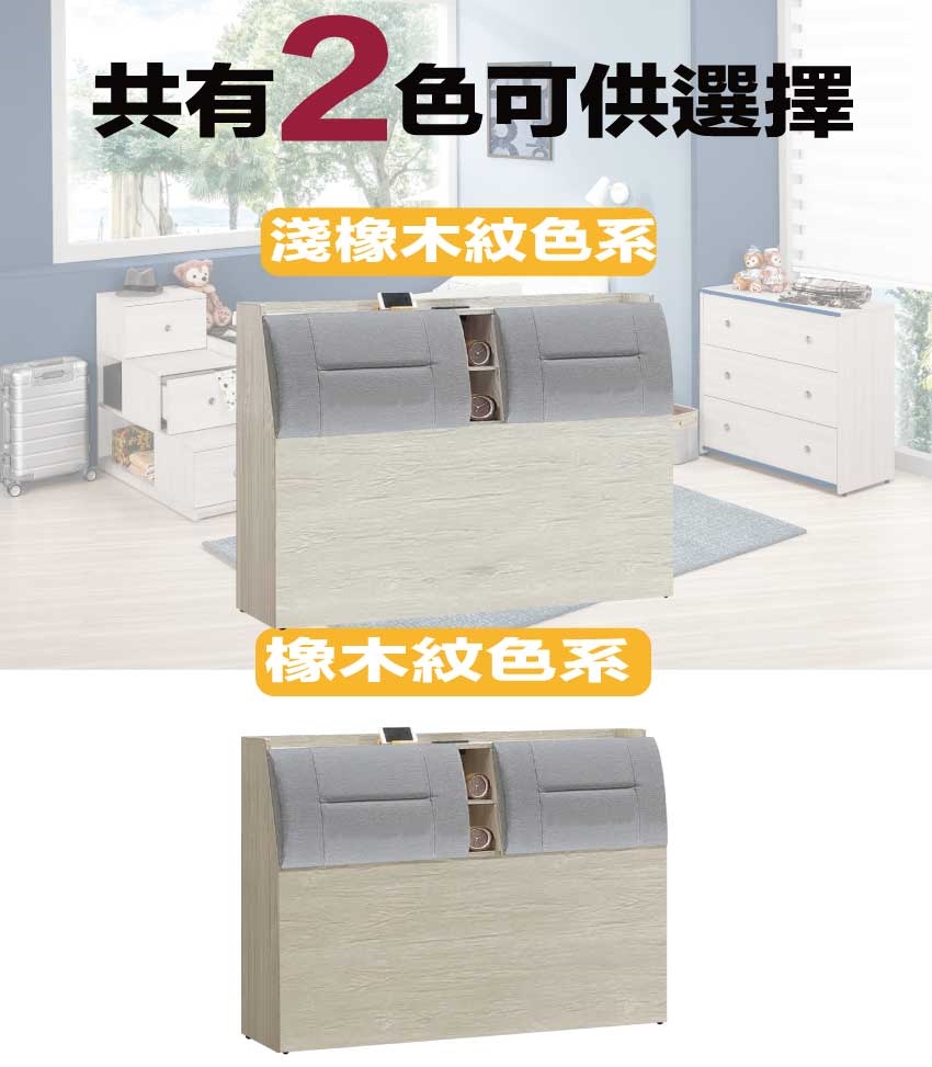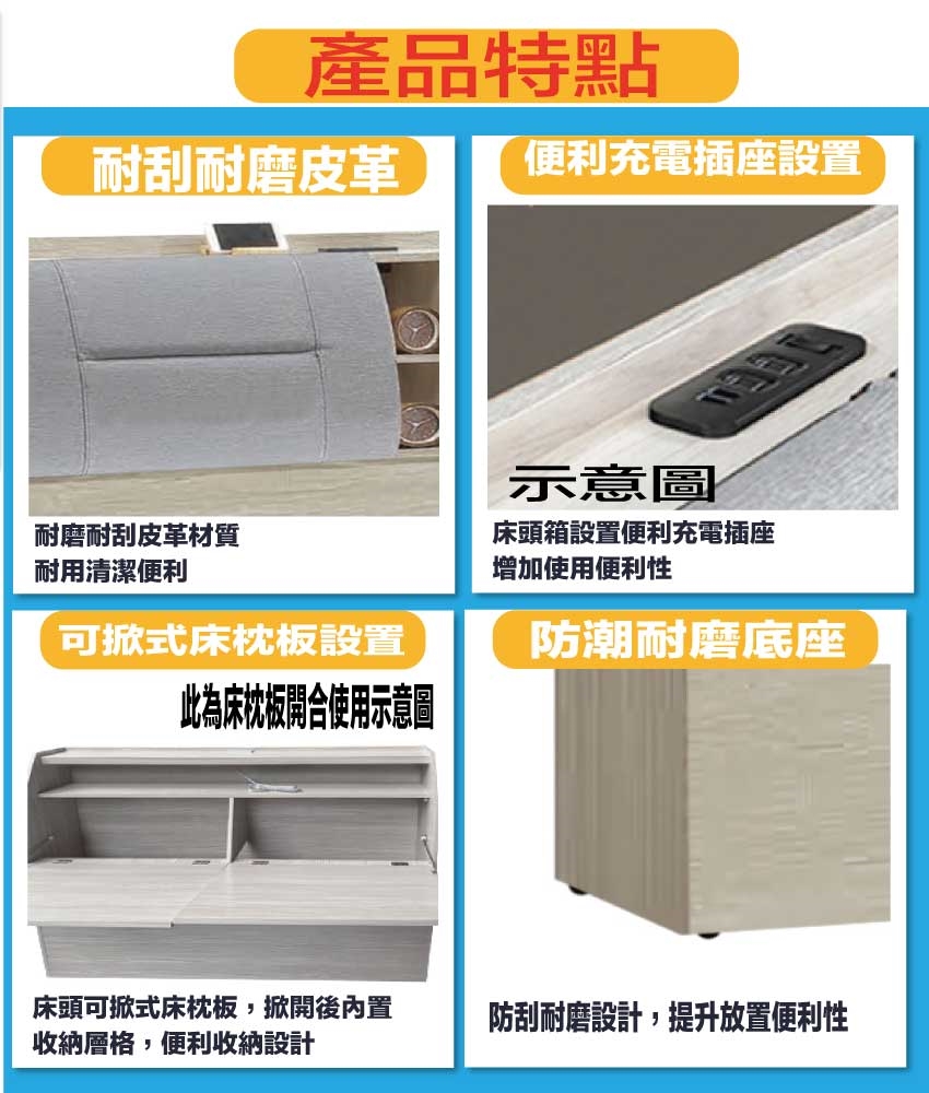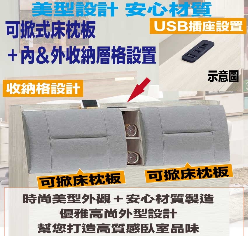 搭配床頭採用可掀式床枕板+內&外收納空間+便利插座設置等收納空間設計